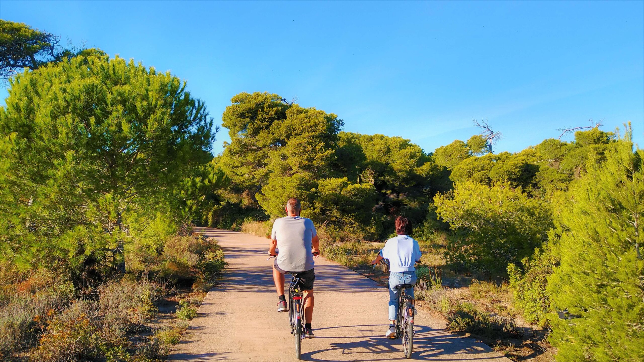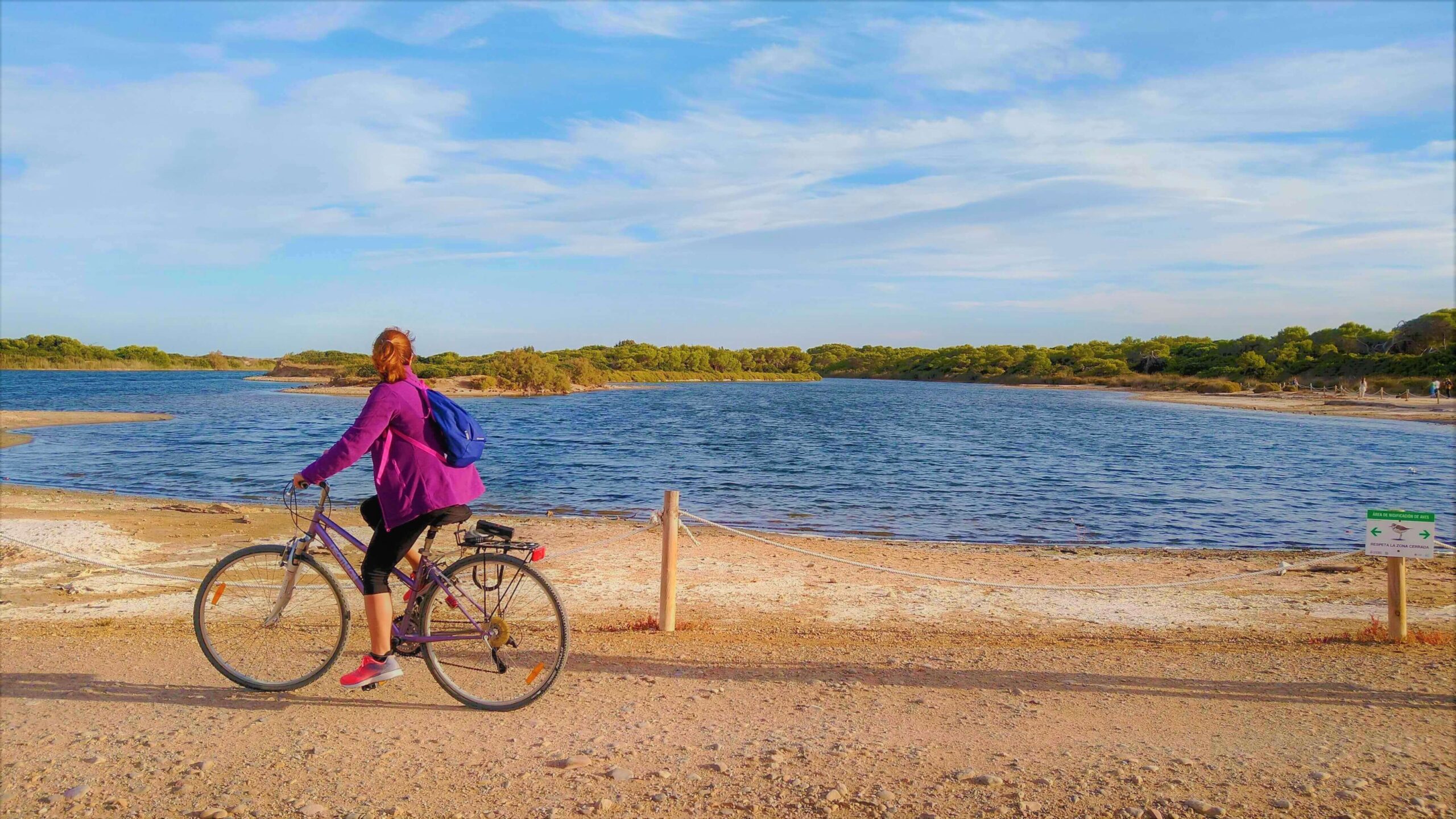The next part of the the beach route is a new tarmac road which has few cars and is shared with bikes, you’ll pass an abandoned former 5 star hotel the Sidi Saler that once accommodated famous guests as Sting & Tina Turner. The next part, a right turn, is stoney and sometimes has puddles but is short. Turn left at the crossroads and cross the bridge over the Gola de Pujol, one of only three channels passing water directly between Albufera Lake and the sea. You have reached Pujol Lagoon . In Season, Flamingos can sometimes be seen here (for a more intimate look, book your slot at the Visitors Centre Racó de L’Olla (see below). You are now in the heart of the Natural Park and it is also a nice part to walk or cycle around, through the pine forests on spacious tarmac paths. If you have time, lock your bike up and follow these nice walking options